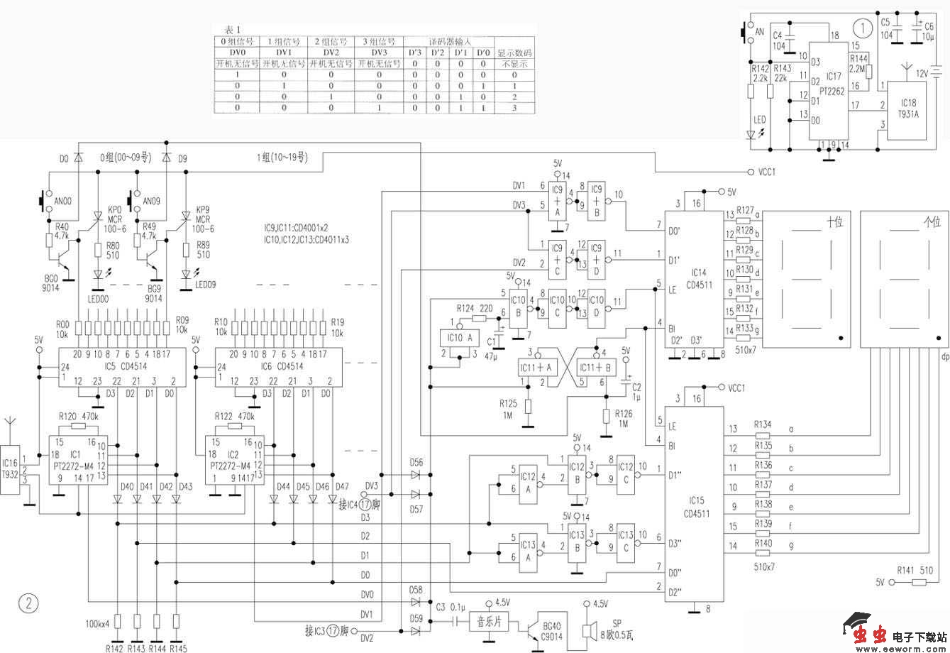 图1是编码发射电路之一,本系统共配置40个发射电路。图2是接收显示电路。我们将40个号码分成四组,即0组、1组、2组、3组(图2中只绘出0组和1组)。对于0组的十个号码00~09,编解码电路地址脚全部悬空,接收器接收到0组的某一发射器的信号时,由IC1解码、IC5译码,并点亮LED00~LED09中的相应指示灯作记忆。此时数码管十位显示0,而个位显示相应的数据码;对于第1组的十个号码10~19,编解码电路均为地址脚1接地,由IC2解码、IC6译码,LED10~LED19中的相应指示灯点亮记忆。此时数码管十位显示1,而个位则显示相应的数据码;依此类推,第2组的十个号码20~29,编解码电路地址脚2接地,数码管十位显示2;第3组的十个号码30~39,编解码电路地址脚3接地,数码管十位显示3。解码电路选用PT2272-M4,暂存型,以防数据叠加。四个解码电路IC1~IC4(其中IC3、IC4未绘出)的数据脚通过隔离二极管D40~D55(其中D48~D55未绘出)连在一起,经过数据处理电路送给IC15,驱动个位数据管显示。