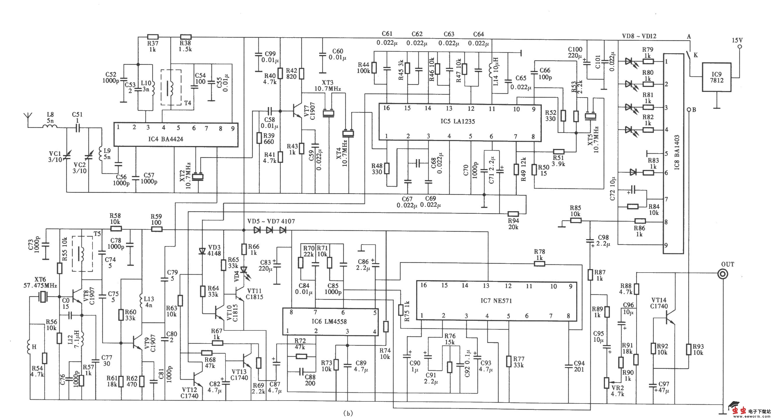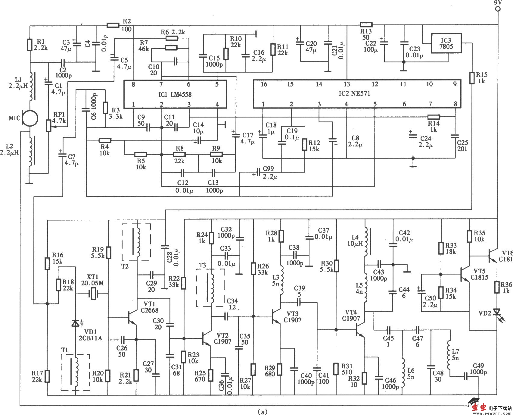 MacsotMR700型无线话筒电路 (a)发射单元电路;(b)接收单元电路