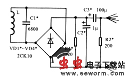 被调制的信号通过VT4和VT5的推动放大以及VT6的功率放大,最后被发射出去。在接收机部分如图72-2(b),其中,L及C1*组成谐振回路,VD1*~VD4*为桥式检波器,R1*、R2*、C2*、C3*组成隔直网络。发射机中的C13、L2与接收机中的L、C1*组成两个谐振回路,其谐振频率均为1MHz。