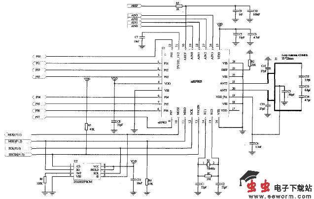 图2是有源标签的基本框图,其中电池可采用普通的3V纽扣电池,图3是射频收发电路的原理图,ANT1和ANT2为天线连接引脚,采用PCB环形差分天线,可以进一步减小标签的体积。25320为EEPROM,在nRF9E5上电后,系统根据引导程序,把25320中的程序代码拷贝到nRF9E5的4KB RAM中。晶振工作频率为16MHz,为了得到精确的内部偏置电压,通常在引脚IREF和地之间接一个阻值为22kΩ,误差为1%的电阻。