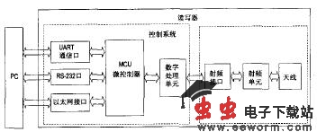 RFID读写器的任务是控制射频模块向标签发射读取信号,并接收标签的应答,对标签的对象标识信息进行解码,将对象标识信息连带标签上其他相关信息传输到主机以供处理。读写器基本结构如图4所示,可以将读写器简化为控制系统和由射频收发器组成的射频模块两个基本的功能块。