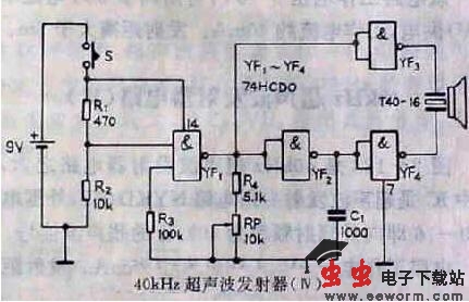 40kHZ超声波发射电路之四,它主要由四与非门电路CC4011完成振荡及驱动功能,通过超声换能器T40-16辐射出超声波去控制接收机。其中门YF1与门YF2组成可控振荡器,当 S按下时,振荡器起振,调整RP改变振荡频率,应为40kHZ。振荡信号分别控制由YF4、YF3组成的差相驱动器工作,当YF3输出高电平时,YF4一定输出低电平;YF3输出低电平时,YF4输出高电平。此电平控制T40-16换能器发出40kHZ超声波。电路中YF1~YF4采用高速CMOS电路 74HC00四与非门电路,该电路特点是输出驱动电流大(大于15mA),效率高等。电路工作电压9V,工作电流大于35mA,发射超声波信号大于 10m。