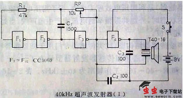 40kHZ超声波发射电路之一,由F1~F3三门振荡器在F3的输出为40kHZ方波,工作频率主要由C1、R1和RP决定,用RP可调电阻来调节频率。 F3的输出激励换能器T40-16的一端和反向器F4,F4输出激励换能器T40-16的另一端,因此,加入F4使激励电压提高了一倍。电容C3、C2平衡F3和F4的输出,使波形稳定。电路中反向器F1~F4用CC4069六反向器中的四个反向器,剩余两个不用(输入端应接地)。电源用9V叠层电池。测量F3输出频率应为40kHZ±2kHZ,否则应调节RP。发射超声波信号大于8m。