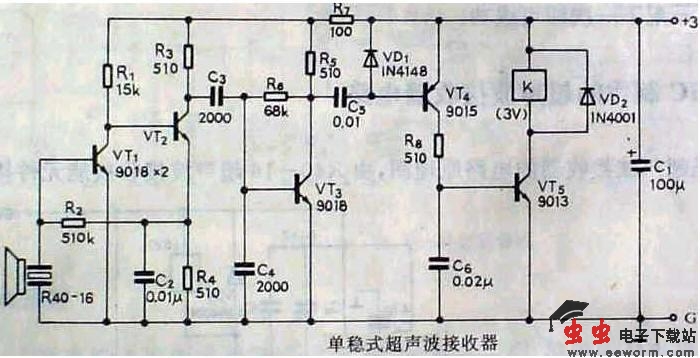 单稳式超声波接收器电路原理图,超声波换能器R40-16谐振频率为40kHZ,经R40-16选频后,将40kHZ以外的干扰信号衰减,只有谐振于40kHZ的有用信号(发射机信号)送入VT1~VT3组成的高通放大器放大,经C5、VD1检出直流分量,控制VT4、VT5组成的电子开关带动继电器K工作。由于该电路仅作单路信号放大,当发射机每发射一次超声波信号时,接收机的继电器吸合一次(吸合时间同发射机发射信号时间相同),无记忆保持功能。可用作无线遥控摄象机快门控制、儿童玩具控制、窗帘控制等。电路中VT1β≥200,VT2β≥150,其他元件自定。电路不需调试即可工作。如灵敏度和抗干扰不够,可检查三极管的β值与电容C4的容量是否偏差太大。经实测,配合相应的发射机,遥控距离可达8m以上。在室内因墙壁反射,故没有方向性。电路工作电压3V,静态电流小于 10mA。