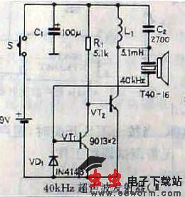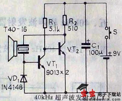40kHZ超声波发射电路之二,电路中晶体管VT1、VT2组成强反馈稳频振荡器,振荡频率等于超声波换能器T40-16的共振频率。T40-16是反馈耦合元件,对于电路来说又是输出换能器。T40-16两端的振荡波形近似于方波,电压振幅接近电源电压。S是电源开关,按一下S,便能驱动T40-16发射出一串40kHZ超声波信号。电路工作电压9V,工作电流约25mA。发射超声波信号大于8m。电路不需调试即可工作。
