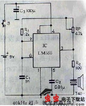 40kHZ超声波发射电路之五,由LM555时基电路及外围元件构成40kHZ多谐振荡器电路,调节电阻器RP阻值,可以改变振荡频率。由LM555第3脚输出端驱动超声波换能器T40 -16,使之发射出超声波信号。电路简单易制。电路工作电压9V,工作电流40~50mA。发射超声波信号大于8m。LM555可用NE555直接替代,效果一样。