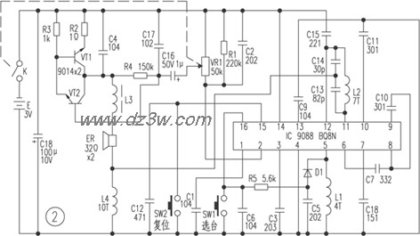 图1为GL-891调频收音机的印板与元件安装位置图,图2是按其测绘出的电路原理图,其上的元件标号均与实物相同。从图2中可以看出,该调频收音机是以一块型号为9088 BQ8N的集成电路为核心组成的,它是一块具有电子调谐并自动锁定频率功能的调频收音机专用芯片,其工作电压为3V,封装形式为塑封贴片式,其各引脚功能如下:{1}、{3}、{6}、{7}、{8}、{9}、{10}、{12}脚均为外接电容端;{4}、{14}脚分别为电源输入端;{2}脚为音频信号输出端;{5}、{16}脚为调频信号调整端;{11}脚为天线信号输入端;{15}脚为复位端。该机的工作原理如下:合上开关K后,3V电源经C18滤波后使供给整机的工作电压比较稳定,此时无线电波经由耳机引线进入到由电容器C13、C14与电感L2共同组成的LC谐振电路送到集成电路的{11}脚,并经其内部的相关电路整形与放大,然后通过微动开关SW1进行电台选择。当电路捕捉到一个较强的电台信号后马上自动锁定,并由其内部电路将其转换为音频信号,且通过{2}脚送到可调电位器VR1进行音量调节后,经电容C16耦合到由三极管VT1、VT2及其外围元件所组成的音频放大电路中去进行放大后推动耳机工作。电容器C4、C17用来滤除残余的高频信号,电感线圈L3、L4用来阻止高频信号进入耳机中,以保证高质量的音质。当需要选台时按动SW1后调频信号将会从低到高进行选台并自动地予以锁定,按动SW2时电路将自动复位到频率最低端。该调频收音机在使用中容易发生的故障现象主要为耳机引线断裂而出现无声,电位器碳膜磨损引起调整音量时伴有杂音,一般只要对症处理即可使其恢复正常,而集成电路的损坏率极低。