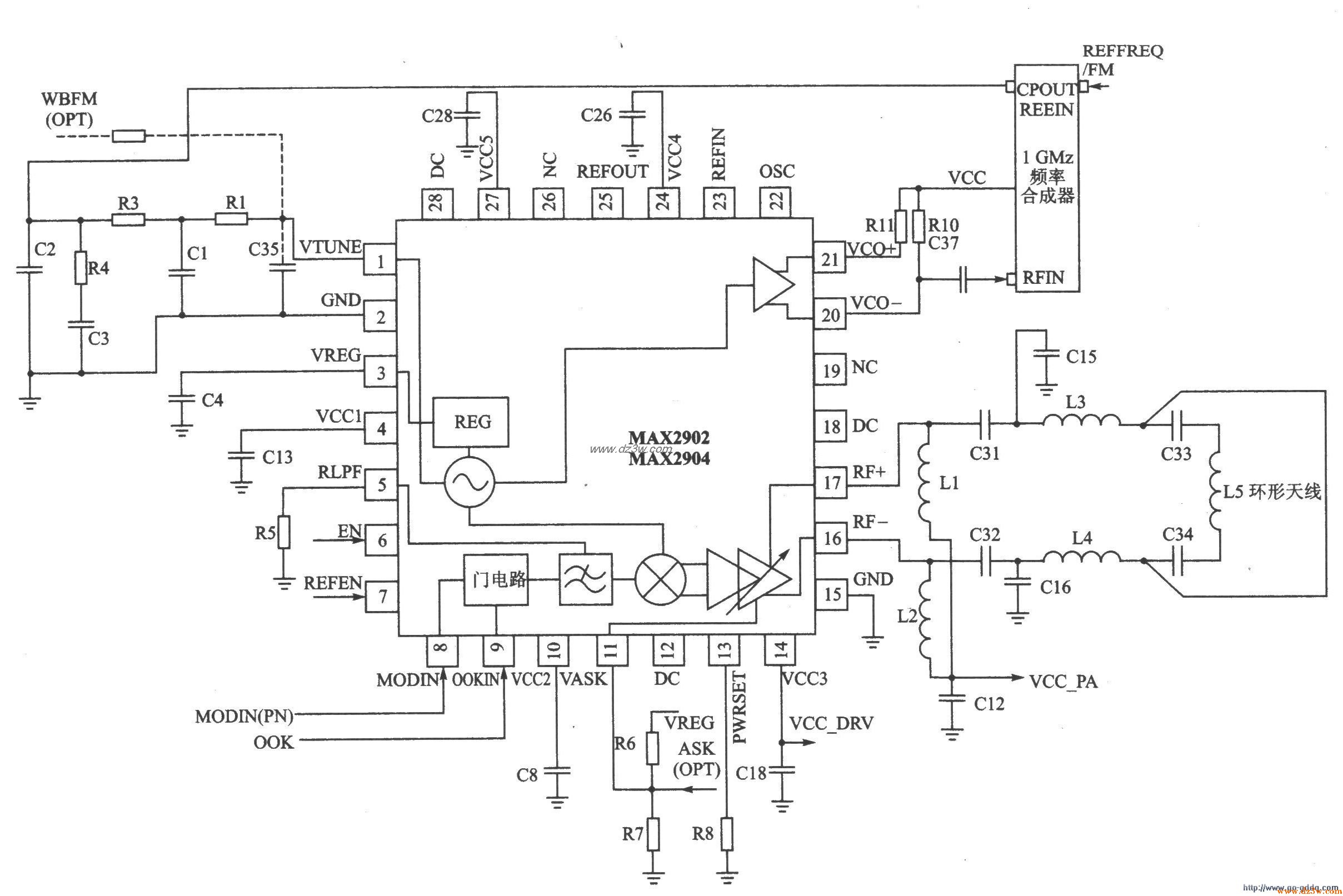 915/868MHz BPSK/ASK/OOK发射器MAX2900/2901/2902应用电路