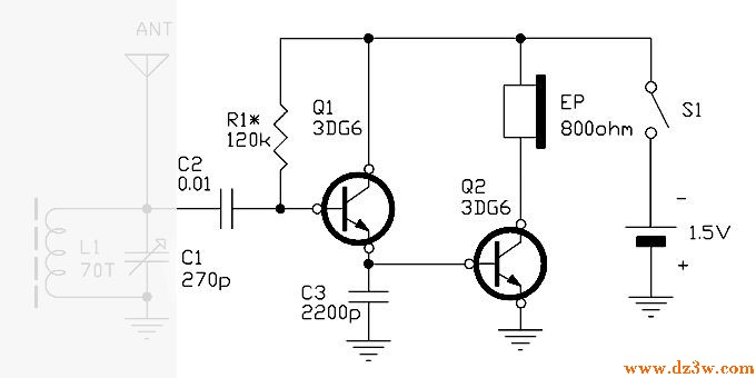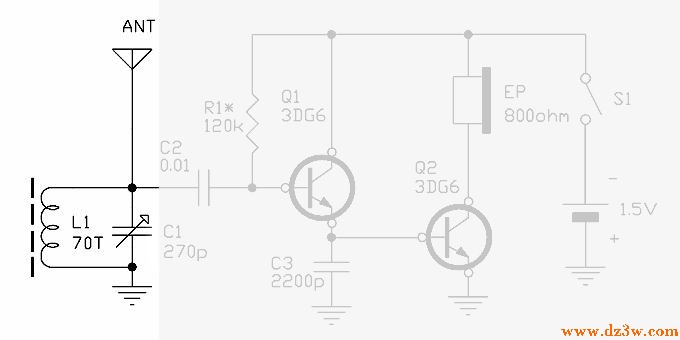 由Q1和Q2等组成的放大电路对电台高频信号f1进行检波和音频放大。其中C2是电台高频信号f1的耦合电容,通过它将f1送入Q1的基极。Q1对f1进行检波和放大,其中R1是Q1的直流偏置电阻。经过Q1检波、放大后的信号变为音频信号(实际是包含高频载波分量的半边包络信号),残余的高频载波信号经电容C3的旁路滤波后再送入三极管Q2的基极进行音频放大,最后驱动耳机发出声音。即电路图中右边的部分。这部分电路其实就是一个十分典型的音频放大电路。