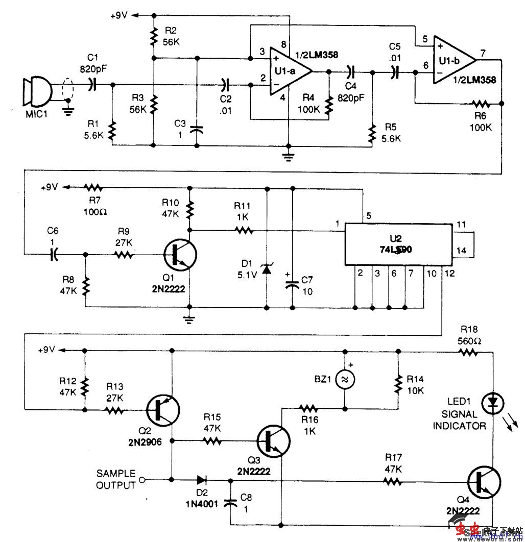 超声波遥控探测器电路 该电路通过MIC1获得超声波音频信号,然后将这些信号放大,并且在集成电路U2,一个74LS90电路中将其分开。U2的输出驱动一个音频放大器,同时利用一个压电元件作为扬声器。