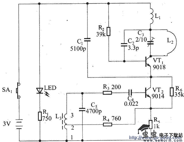 本电路的发射频率调整在28~29.7MHz范围内.VT2 ,C5,L3等组成音频振荡器,频率约为15kHz.