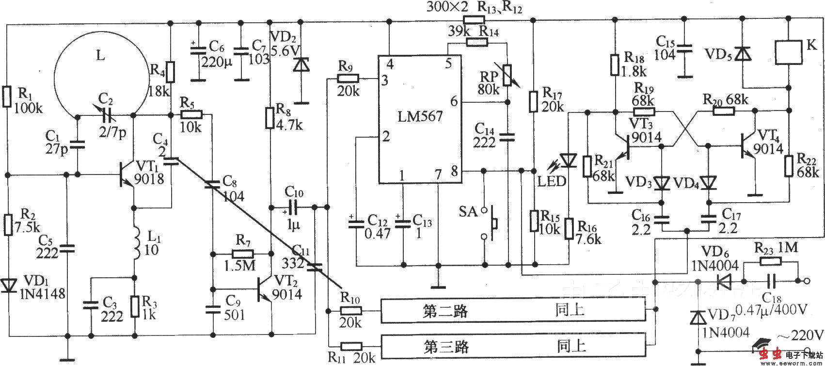 遥控电源插座的工作电源采用阻容降压半波整流,接收部分使用稳压管稳压.接收机电路采用电路简单的超再生式接收电路.