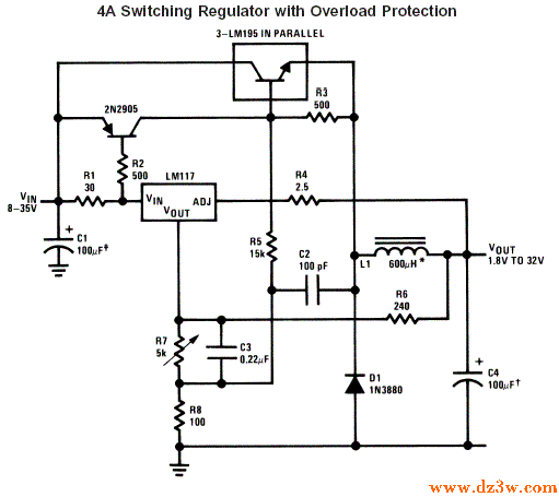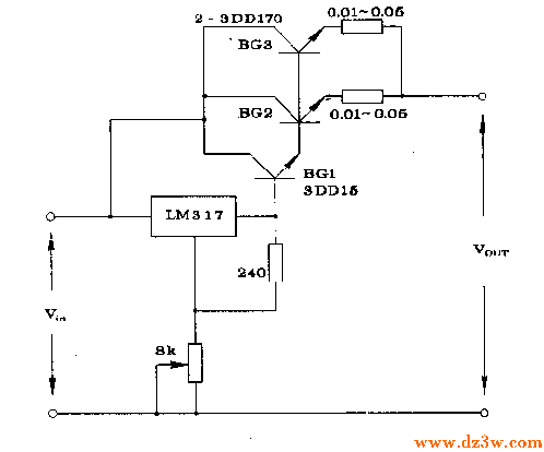如图3所示的电路即由LM317首先驱动BGl—3DDl5,再由GBl驱动BG2、BG3——两只3DDl70管子,这时,稳压器可输出20A的电流。