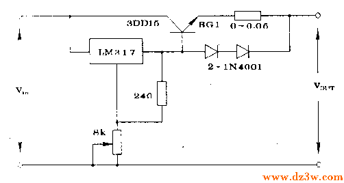 图2所示的电路,是用NPN型大功率管来扩流的实例。这时一只3DD15可提供负载5A电流、LM317可提供1.5A电流,输出端约可提供6.5A电流。这时,两只二极管起隔离作用,两只或多只大功率管并联也可将电流扩至更大。