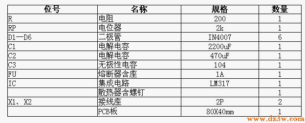 下面是LM317可调稳压电源电路图的元器件清单: