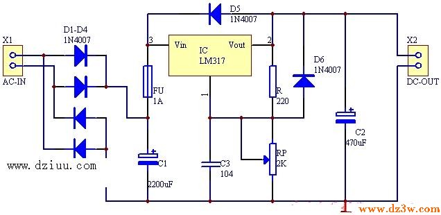 下面是LM317可调稳压电源电路图: