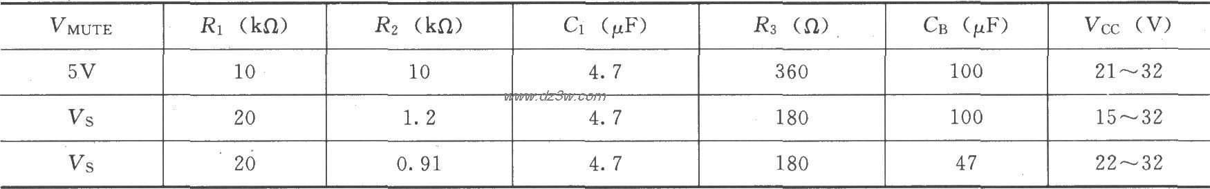 如图所示为由LM4752构成的具有静噪功能的音频功率放大电路,利用三极管2N3904及其外围元件组成外部强制静噪电路。当静噪电压VMUTE为高电平时,三极管2N3904饱和导通,LM4752的5脚被拉至低电平,内部放大器输入级被关断,元音频信号被放大;当静噪电压VMUTE为低电平时,三极管2N3904截止,LM4752的5脚被释放,内部放大器输入级工作,音频信号允许放大输出。三极管2N3904及其外围元件取值见下表。