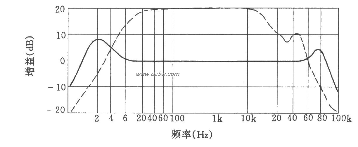 威廉逊电子管功放电路图 整机频率特性: 上图曲线中,虚线为未加频率补偿前的频响曲线图;实线为加频率补偿后的频响曲线图。