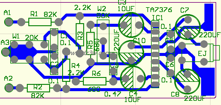 说明:电路原理图中,W1为双联电位器,用于低音增强,W2为调节混响效果。印刷电路板图中,A1,A2为左右声道输入。电位器W1和W2都固定在盒子的边缘,其中W2为带开关的电位器。PCB下载: