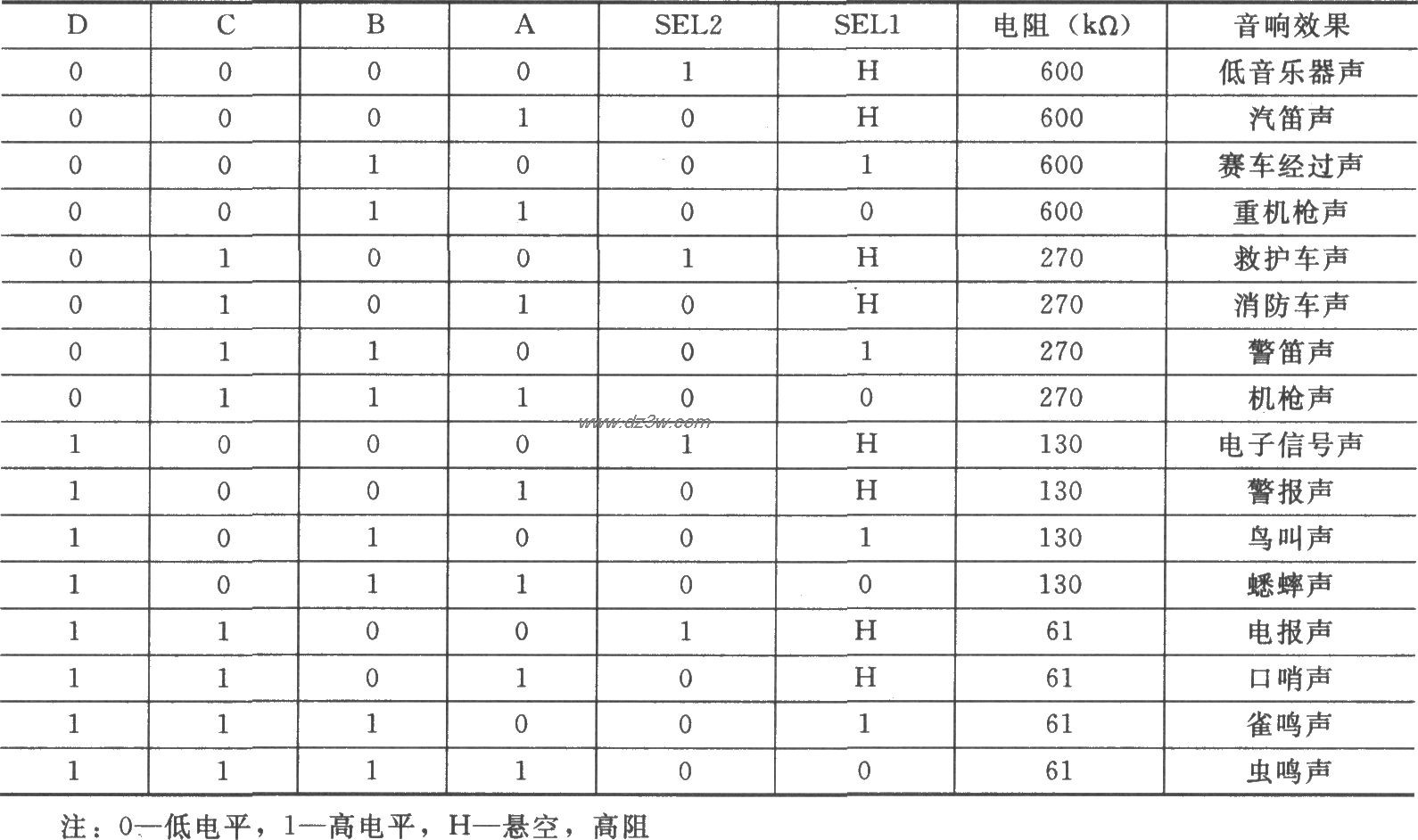 十六声音响发声电路采用另一只模拟发声电路KD9561组成。按照其电路内部的固化程序,KD9561内部包含了4种模拟声音响效果,即机枪声、警笛声、救护车声和消防车声。它有两个发声触发端SELl和SEL2,分别可用高、低电平或将其悬空来触发。该电路的特点:如果改变它的振荡电阻的阻值并对两个触发端采用不同的触发电平,通过组合变换,可组成能发出16种声响的发声电路,其电路组成如图所示。KD9561的16中声响表: