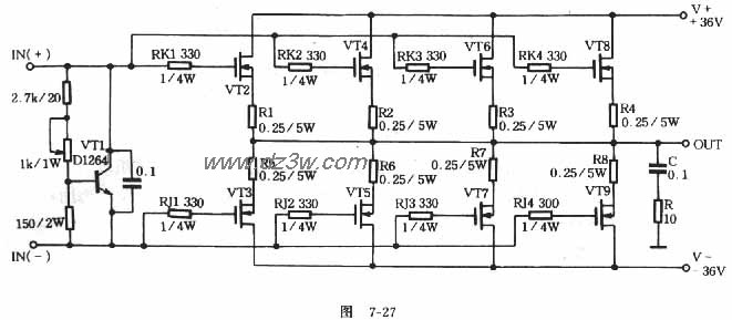 场效应管功放级电路原理,差分排动级原理如阁7-26所示。差分输入级采用场效应挛生模块NPD5565S,其参数为VDss=55V,iDss=6~15mA,其输入特性非常好(高输入阻抗),如无NPD5565S,也可用其它小功率N沟道管,耐压要求大于100V,Gm值配对,误差要小于2%。VR既是源极负反馈电阻也是中点电位调零电阻。VT3、VT4是镜像恒流源的特点是对直流电路近似通路,而对交流而言是开路,这样就能满足各管的直流工作点,又能使交流信号尽可能地传送到下一级,这对于推动级来说是最好的,又因不用传统的普通直流放大器的中点伺服电路,使得中点电位调零极方便、简单。VT5、VT6为电压放大级,因本电路采用电流倾注式,R4决定VT5、VT6的工作电流大小,故调节R4、使VT5、VT6的工作电流为80mA,工作在甲类状态,一方面可以消除可怕的交越失真,另外可使它的负载能力加强。如果中点电位调到零点但不稳定(即中点飘移),这时可把R6的阻值减少,采用6.8kohm或4.7kohm,但阻值不能小于4.7kohm,而且VT3~VT6的散热面积要足够大。
