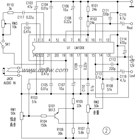 该电路的核心部分由一只直流音调控制IC、一只NPN型三极管和四个电阻共同够成。其它元件均为所用直流音调控制IC本身需要的外围元件。大多数直流音调控制IC已经自己给直流音调控制电路提供了基准电平(多为+5V),但μPC1892等直流音调控制IC例外,需由外部为其提供+5V直流基准电平。图1为此功能电路的原理图,图2为应用实例。
