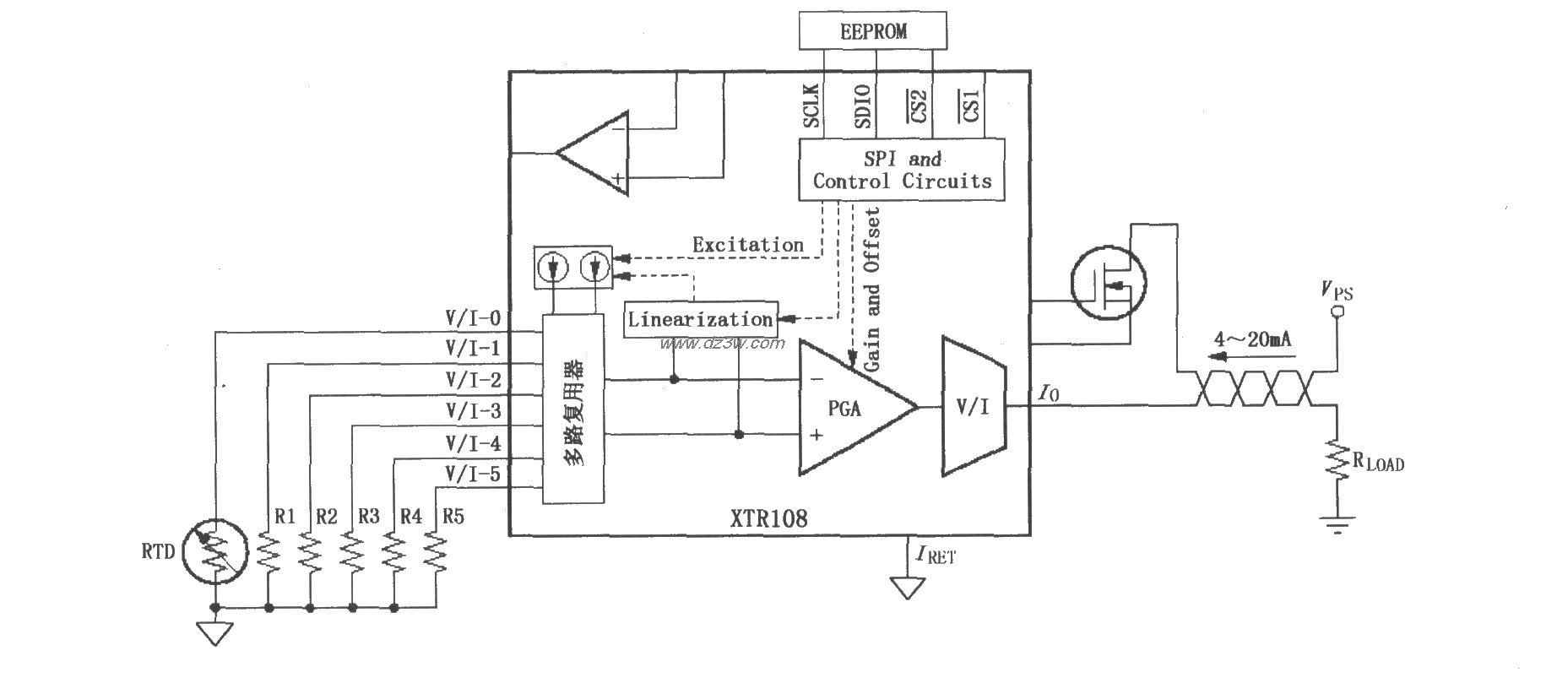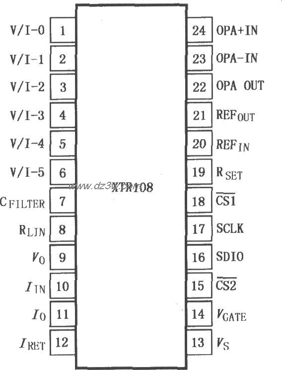 XTR108是用于温度和电桥式传感器的“灵巧”可编程的4~20mA两线电流变送器。在模拟信号通道内,通过一个标准串行接口对零点、步长和线性化误差进行校正,无需人工微调,外部非挥发性E2PROM存储校正设置。全模拟信号通路包括输入多路复用器、自动零点校正可编程增益仪表放大器、双可编程电流源、线性化电路、电压基准、辅助校准器、内部晶振、控制逻辑和一个输出电流放大器。由于传感器直流失调电压引起的电平偏移,可编程补偿可选择升和降标定输出,当失去电源时自动复位到初始状态。通过多路复用器引入电流源,能用于直接激励RTD温度传感器、压力式电桥或其他传感器。XTR108内部的独立运放可完成电流-电压的变换,其额定温度为-40~ 85℃。XTR108的引脚排列如图所示。