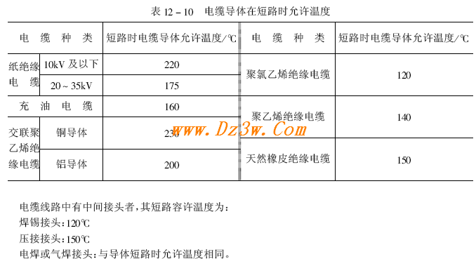 在运行中发生短路故障时,通过的电流将突然增加很多倍,短路情况下的电缆导体允许温度不超过表12-10所列值。