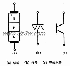 双向触发二极管亦称二端交流器件(DIAC),与双向晶闸管同时问世。由于它结构简单、价格低廉,所以常用来触发双向晶闸管,构成过压保护电路、定时器等。双向晶闸管的结构、符号及等效电路如图1所示。它属于三层构造、具有对称性的二端半导体器件,可等效于基极开路、发射极与集电极对称的NPN晶体管。正、反向伏安特性完全对称,见图2。当器件两端的电压V小于正向转折电压V(BO)时,呈高阻态;当V>V(BO)时进入负阻区。同样,当V超过反向转折电压V(BR)时,管子也能进入负阻区。转折电压的对称性用⊿V(B)表示,⊿V(B)= V(BO)-V(BR),一般要求⊿V(B)<2V。双向触发二极管的耐压值(V(BO))大致分三个等级:20~60V,100~150V,200~250V。图3是由双向触发二极管和平共处双向晶闸管组成的过压保护电路。当瞬态电压超过DIAC的V(BO)时,DIAC导通并触发双向晶闸管也导通,使后面的负载免受过压损害。下面介绍用兆欧表和万用表检查双向触发二极管的方法。(1)将万用表拨于R×1k(或R×10档),因为DIAC的V(BO)值都20V以上,所以测量正、反向电阻值均为无穷大。(2)按图4接好电路。由兆欧表提供击穿电压,并用直流电压表测量DIAC的正向转折电压V(BO)。然后调换DIAC的电极,测出反向转折电压V(BR)。最后检查转折电压的对称性。实例之一:选择ZC25-3型兆欧表,将500型万用表拨至50VDC档。被测触发二极管为DB3型,其外形与检波二极管相似,管壳呈天蓝色。主要参数是:V(BO)=35V(典型值),峰值脉冲电流Ipk=5mA。首先用R×1k档测量正、反向电阻均为无穷大。然后按图5.9.19所示方法分两次测得:V(BO)=28.5V,V(BR)=28.0V。由此算出⊿V(B)=0.5V<2V 。该管子的正、反向转折电压较典型值稍低些,但转折电压的对称性很好。实例之二:测量两只耐压30V的玻封双向触发二极管(具体型号未标出),测量数据整理成表1。说明两只被测管性能良好。注意事项:因双向触发二极管具有对称性,故可从两次测量值中任选一个定义为V(BO)。现取数值较大的作为V(BO),数值较小的作为V(BR)。